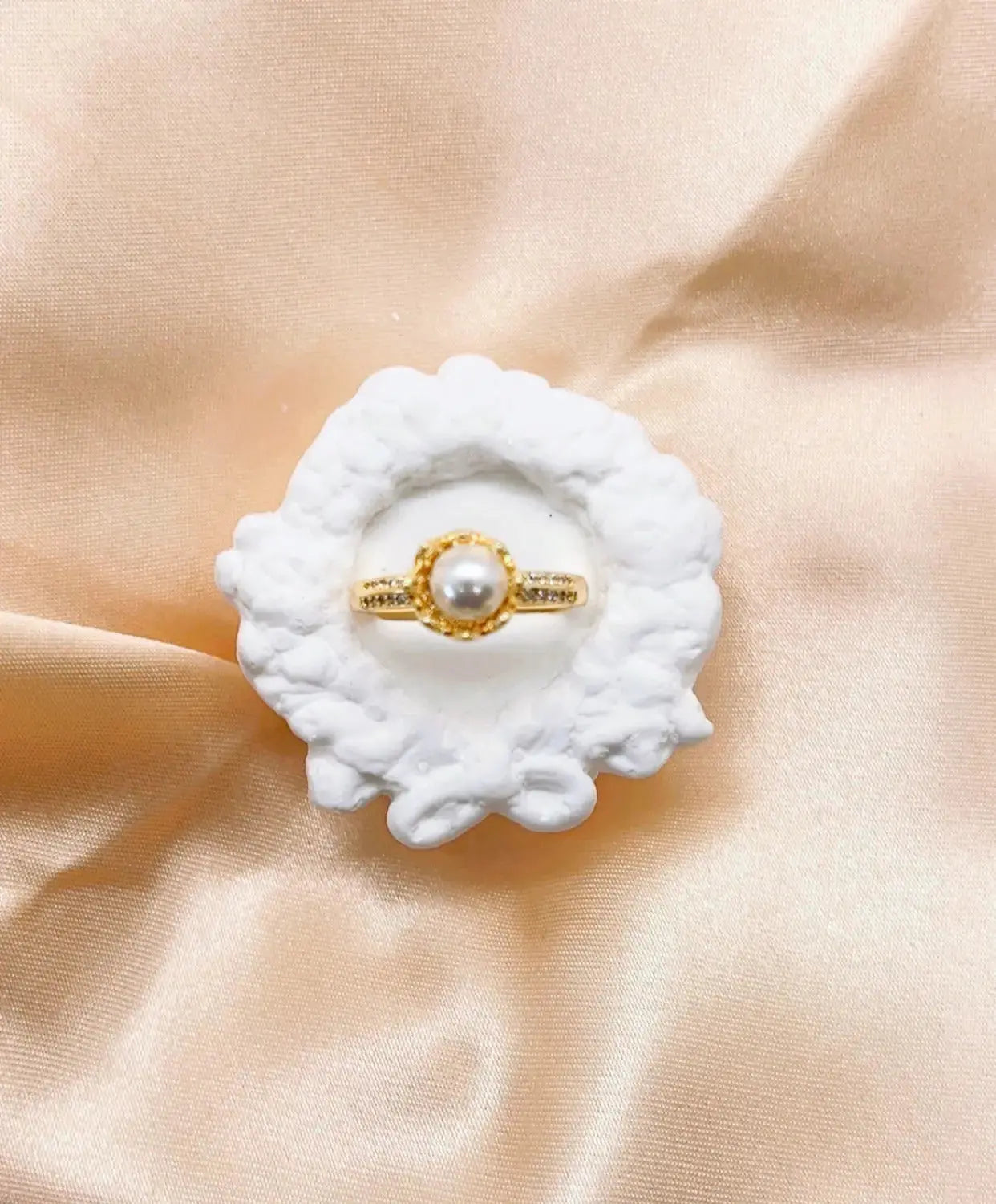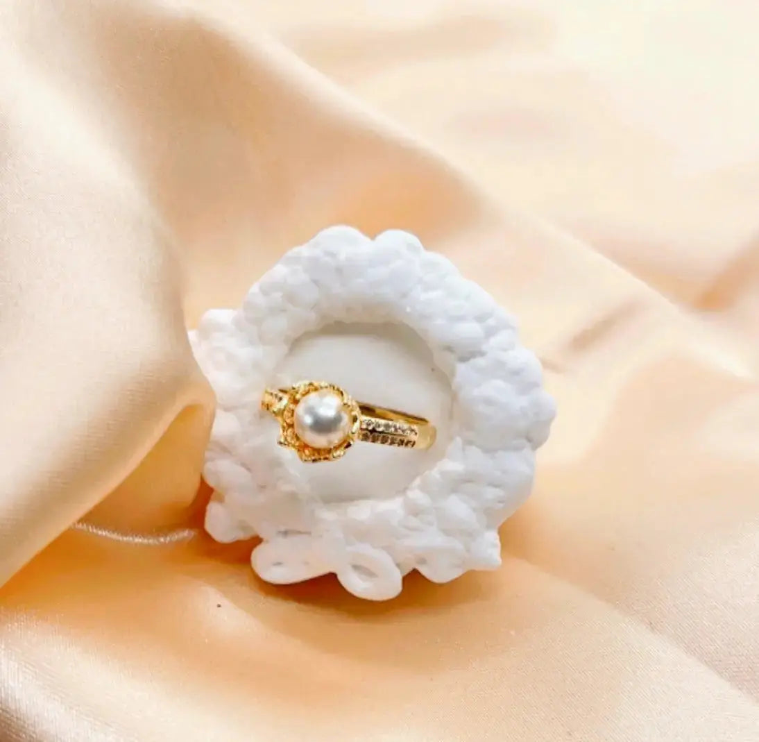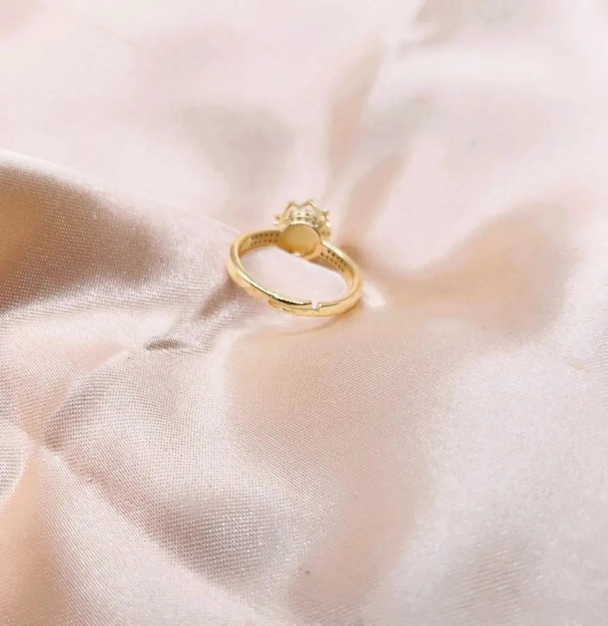 Cette bague ajustable en acier inoxydable doré adopte une élégante forme de couronne argentée, ornée d’une perle blanche nacrée et de petits strass étincelants.