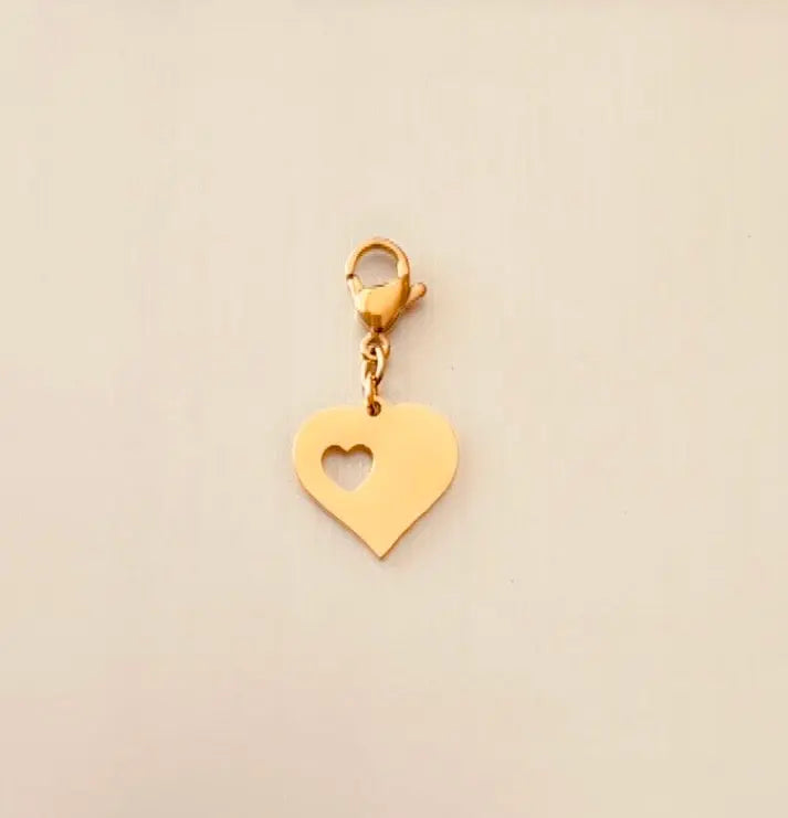 Exprimez vos émotions avec ce charm raffiné en forme de cœur plein, délicatement ajouré d’un petit cœur ouvert en son centre. Ce bijou élégant représente l’amour protecteur, les liens sincères et les sentiments partagés. Grâce à son mousqueton doré pratique, il se fixe en un geste sur vos colliers, bracelets ou chaînes de cheville – sans avoir à les retirer.