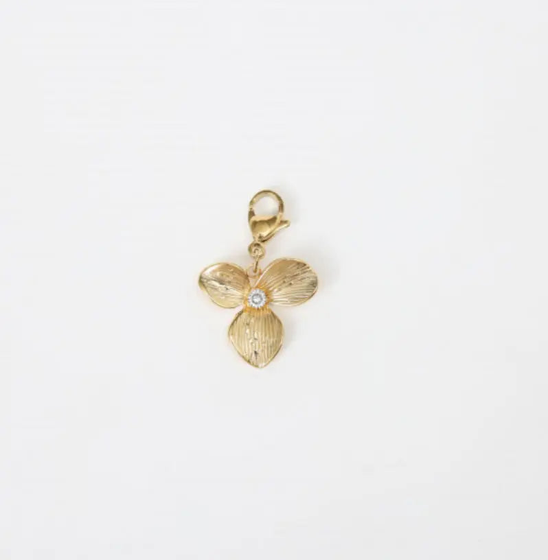 Apportez une note de douceur et d’élégance naturelle à vos bijoux avec ce charm en forme de fleur à trois pétales, sublimé par un strass blanc serti au centre. Grâce à son mousqueton doré pratique, vous pouvez l'accrocher ou le retirer sans avoir à enlever votre collier, bracelet ou chaîne de cheville. Idéal pour composer un bijou raffiné et personnalisé.