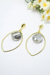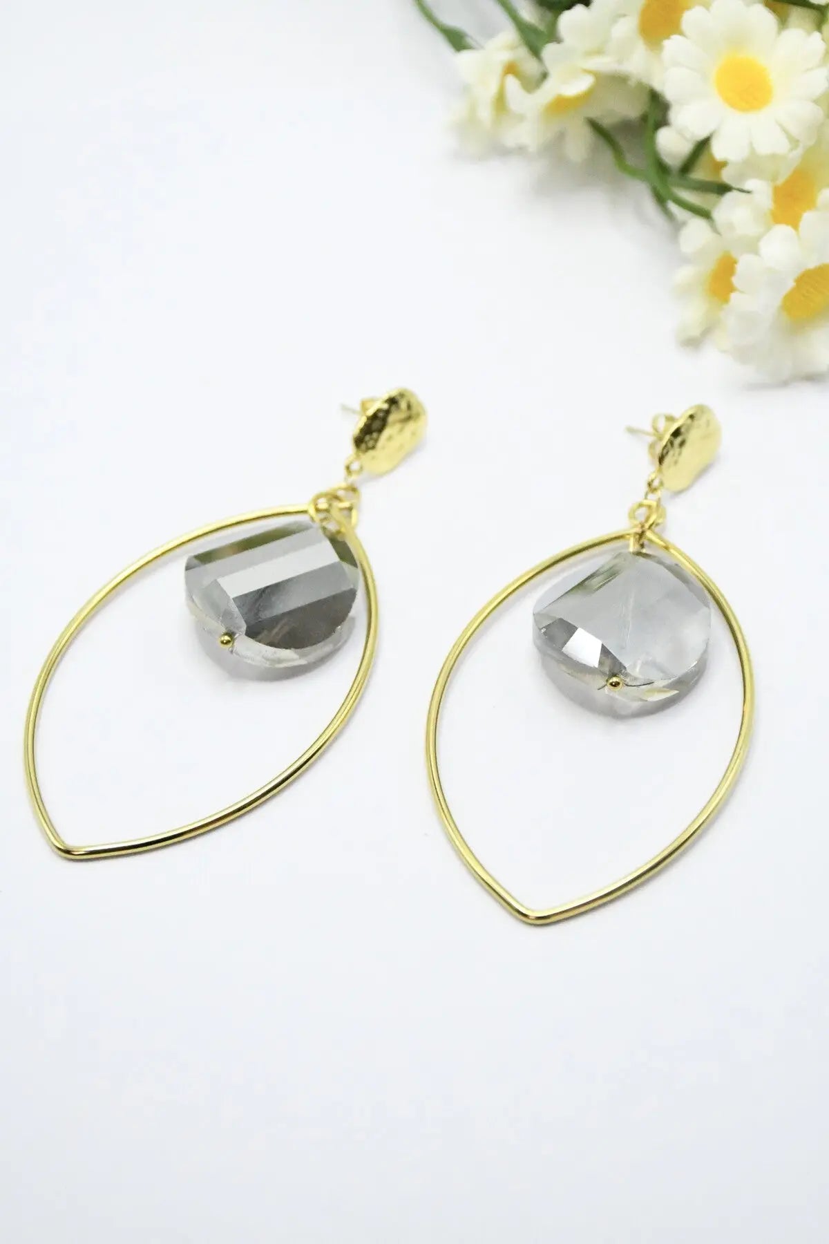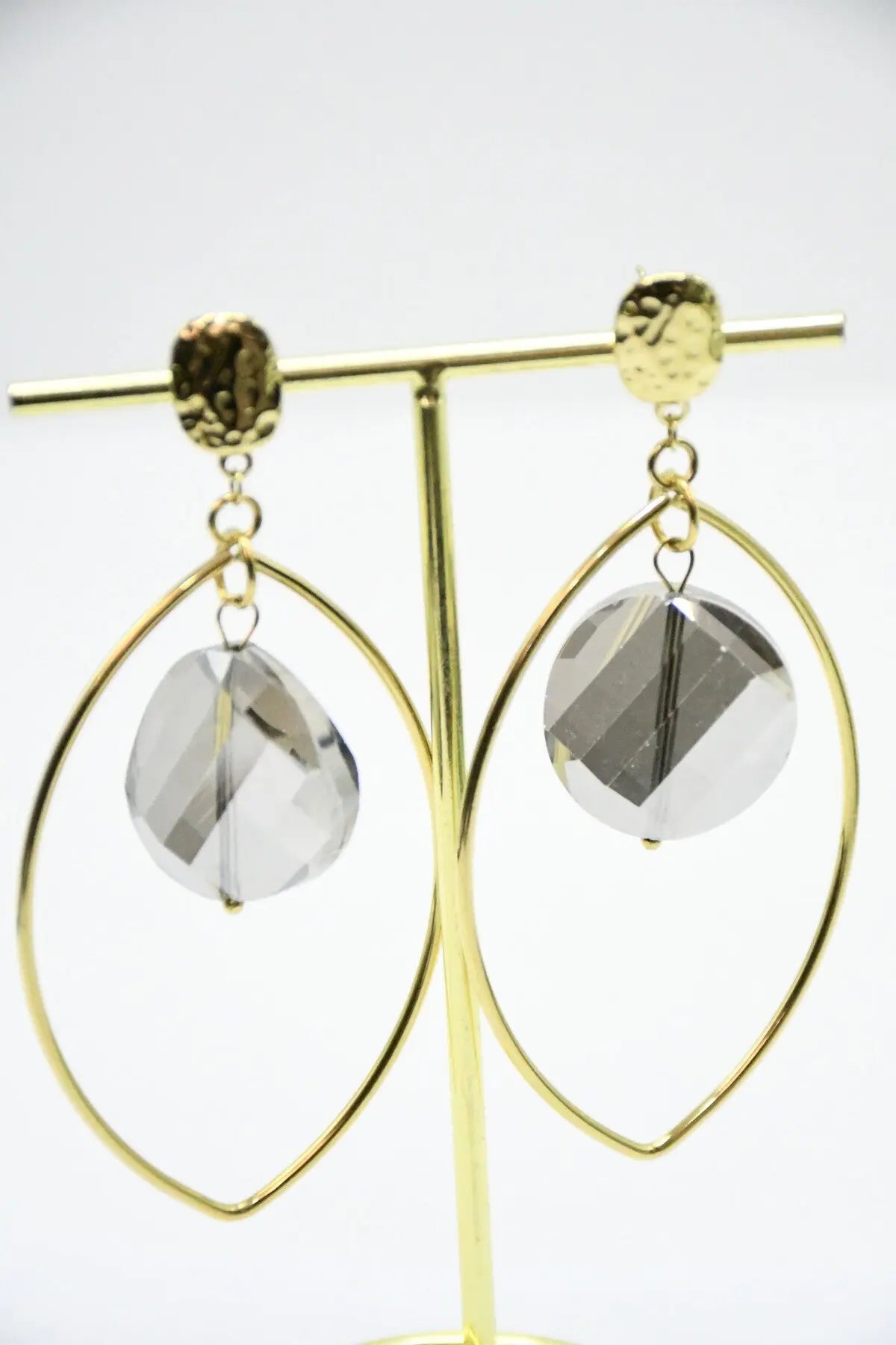 Boucles d’oreilles pendantes créoles ovales avec pierre noire transparente et breloque martelée "Malta"