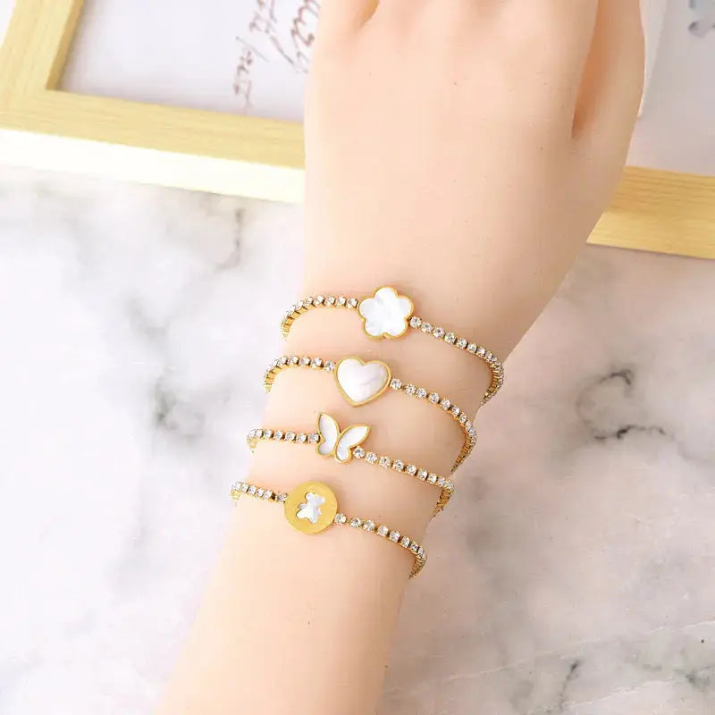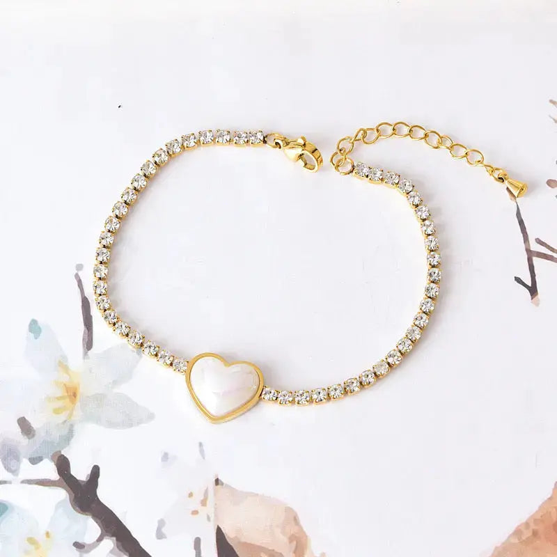 Succombez au charme de la délicatesse avec notre bracelet en acier inoxydable doré, orné d’un cœur nacré blanc au centre et entouré de strass brillants. Une création féminine, chic et lumineuse.