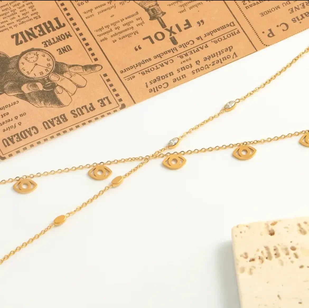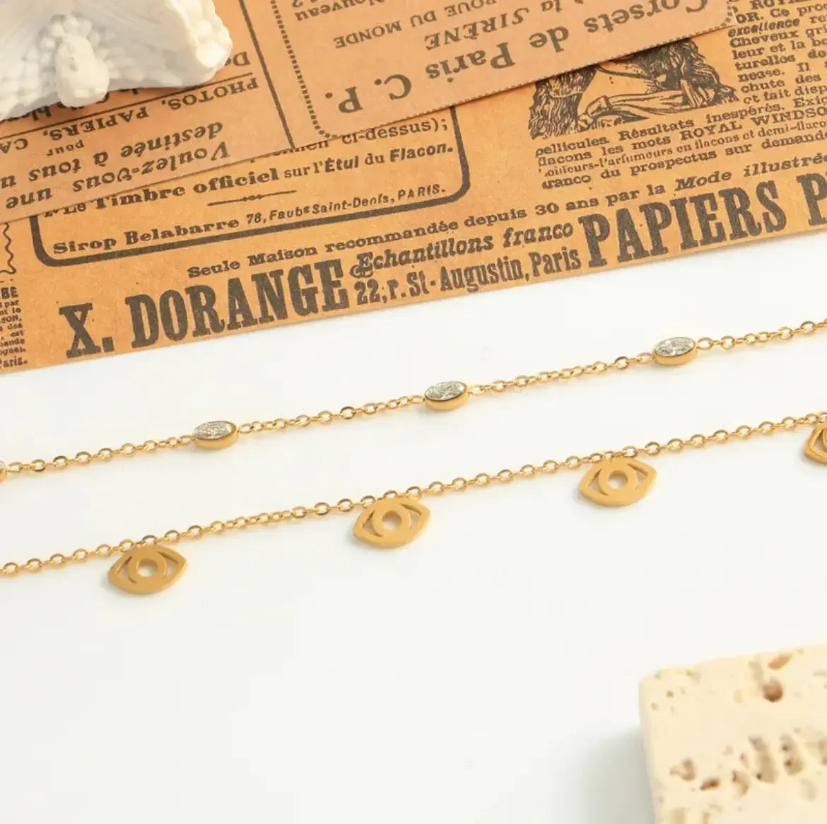 Chaîne de Cheville Double Dorée – Œil Protecteur & Strass Losange | Acier Inoxydable " Osana"