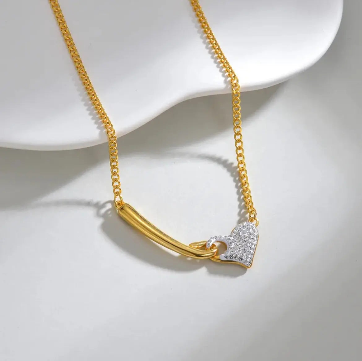 Ajoutez une touche de romantisme à votre style avec notre collier doré en acier inoxydable, sublimé par un pendentif cœur délicatement orné de strass.