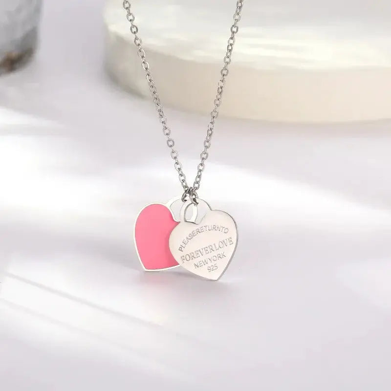 Ce collier argenté en acier inoxydable 316 présente un duo de cœurs entrelacés : l’un rose tendre, l’autre argenté gravé "Forever Love New York 325". Sa rallonge ajustable assure un confort parfait. Livré dans un écrin élégant.