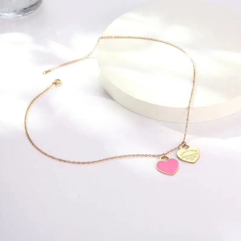 Ce collier en acier inoxydable 316 finition or rose associe un cœur rose tendre à un cœur or rose gravé "Forever Love New York 325". Idéal pour un cadeau ou une touche d’élégance quotidienne.