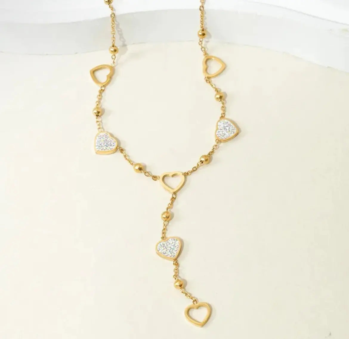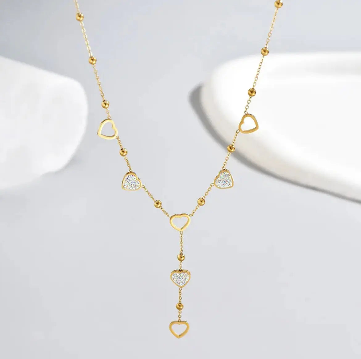 Collier Doré avec Cœurs et Perles Pendantes – Chaîne Fine Décolletée – "Shiny"