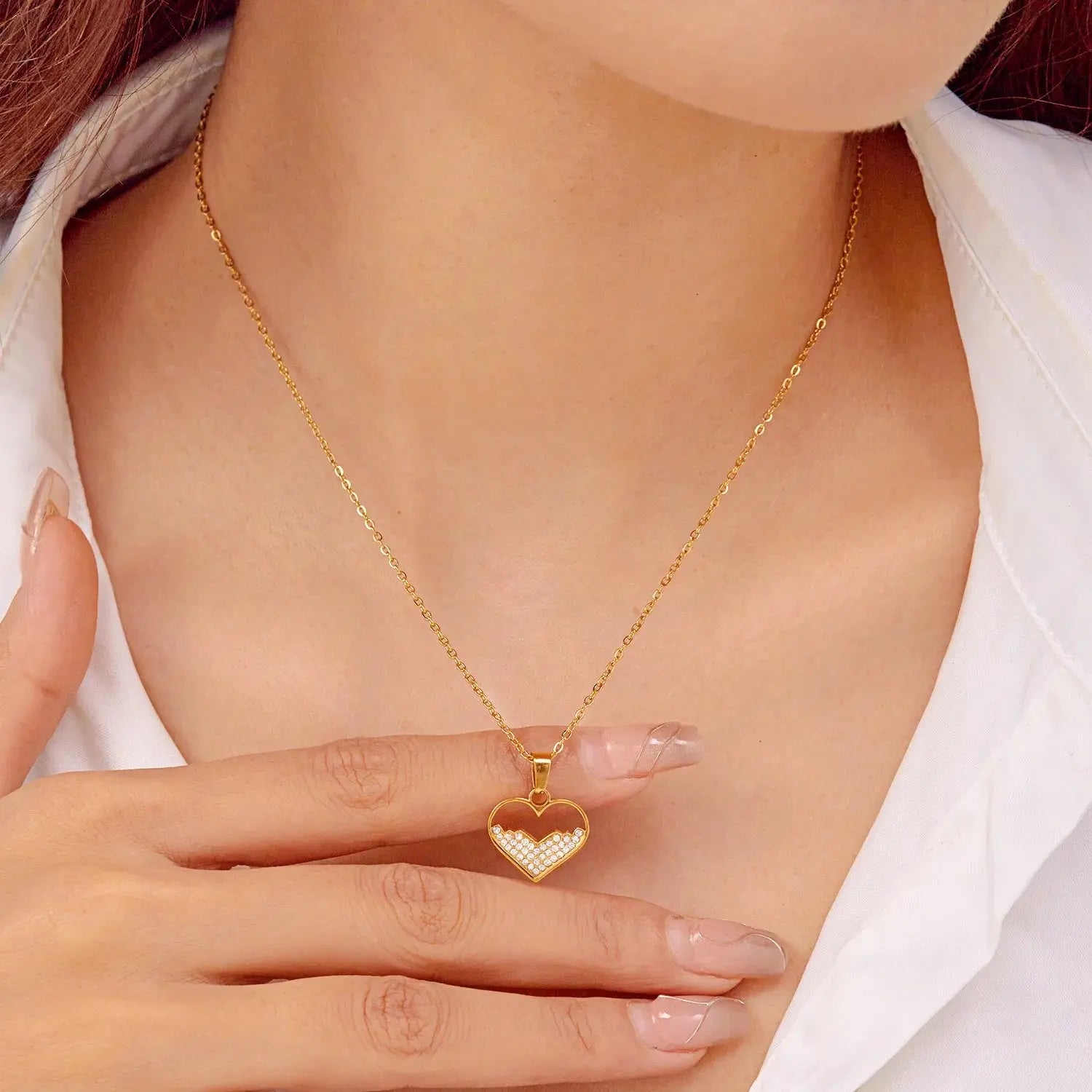Ce collier en acier inoxydable doré met à l’honneur un pendentif en forme de cœur creux, dont une moitié est incrustée de strass blancs scintillants. Ce jeu d’équilibre entre minimalisme et éclat en fait un bijou parfait pour un look élégant, romantique ou quotidien.