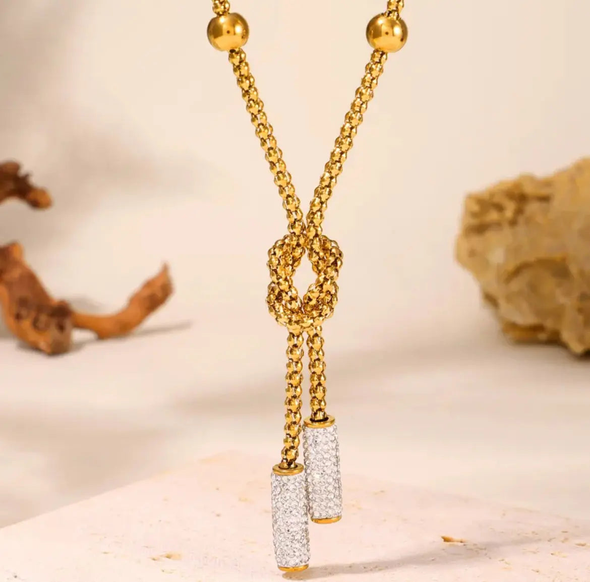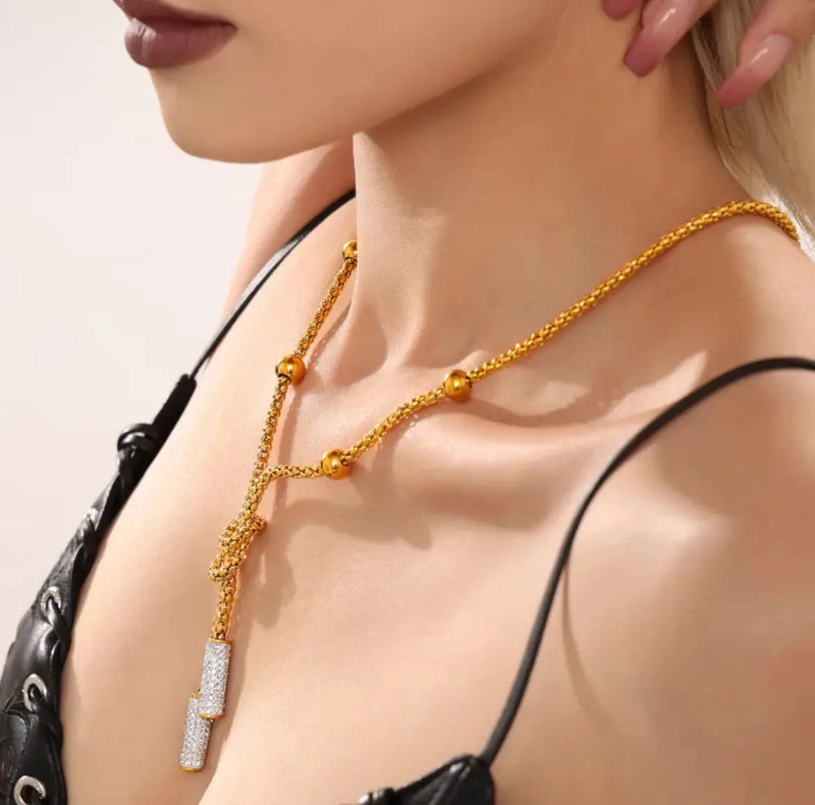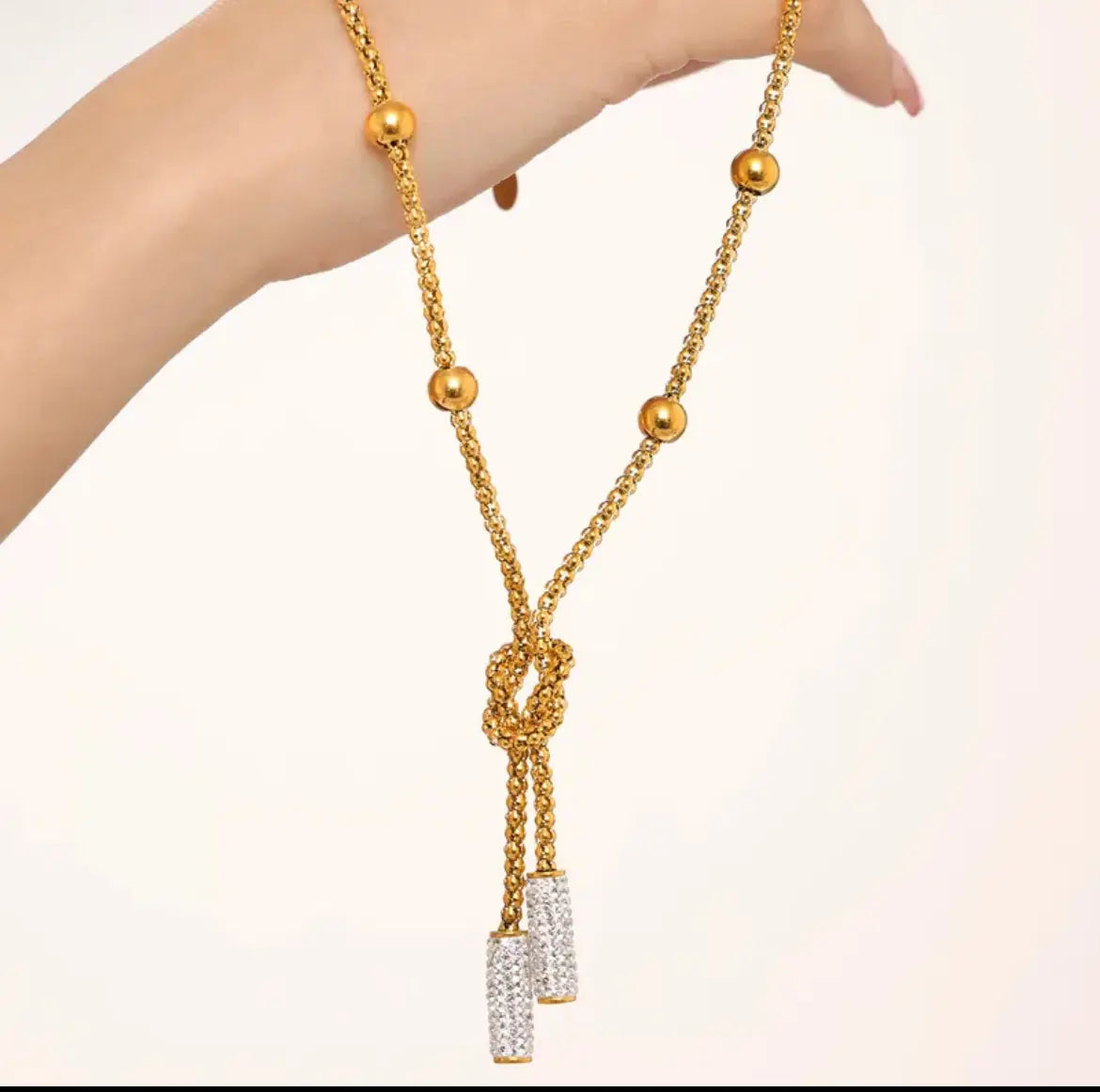 Optez pour le style affirmé et tendance avec ce collier en acier inoxydable doré, composé d’une chaîne épaisse ponctuée de boules dorées, d’un nœud élégant au centre et de deux pendentifs scintillants ornés de zircon blanc. Un bijou à la fois puissant et sophistiqué, parfait pour rehausser vos tenues de jour comme de soirée.
