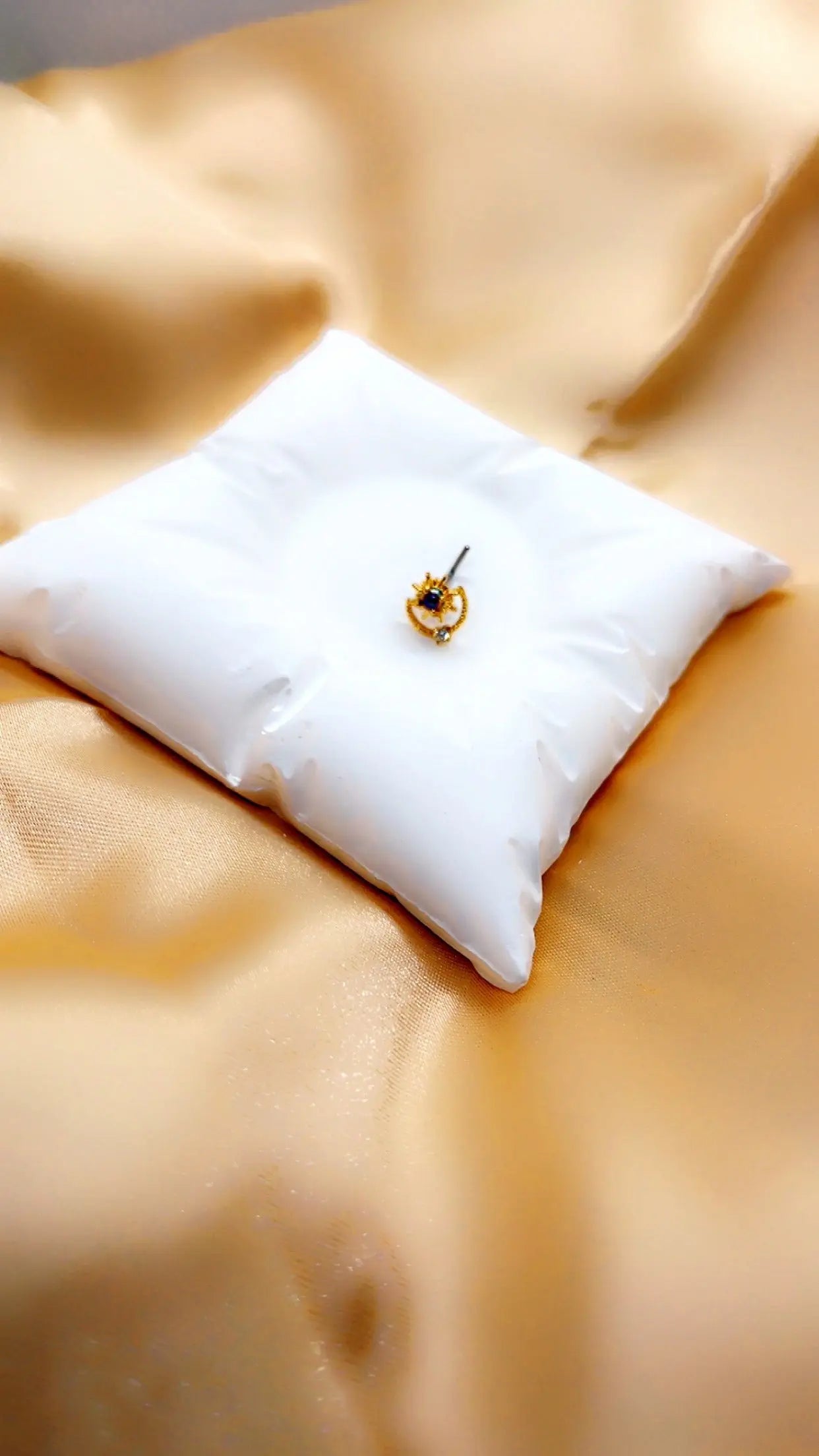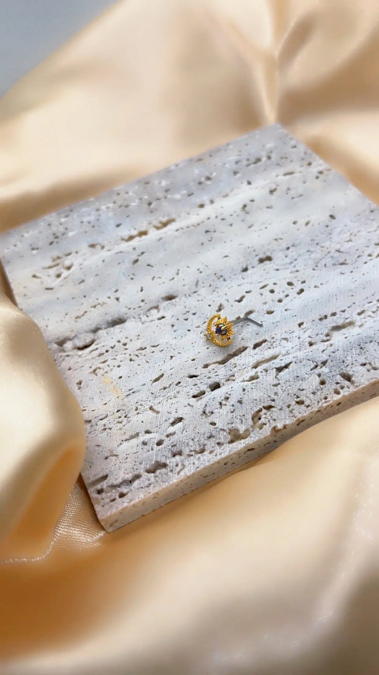 Ce piercing de nez en acier inoxydable doré allie finesse et originalité. Il est orné d’une étoile stylisée renfermant un strass nacré violet, associé à un demi-cercle délicat dans lequel brille un petit strass blanc. Un design inspiré des astres, pour un look féérique et raffiné.