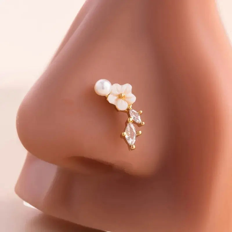 Piercing Nez Fleur & Perle Blanche – Zircons + Écrin Offert "Carissa"