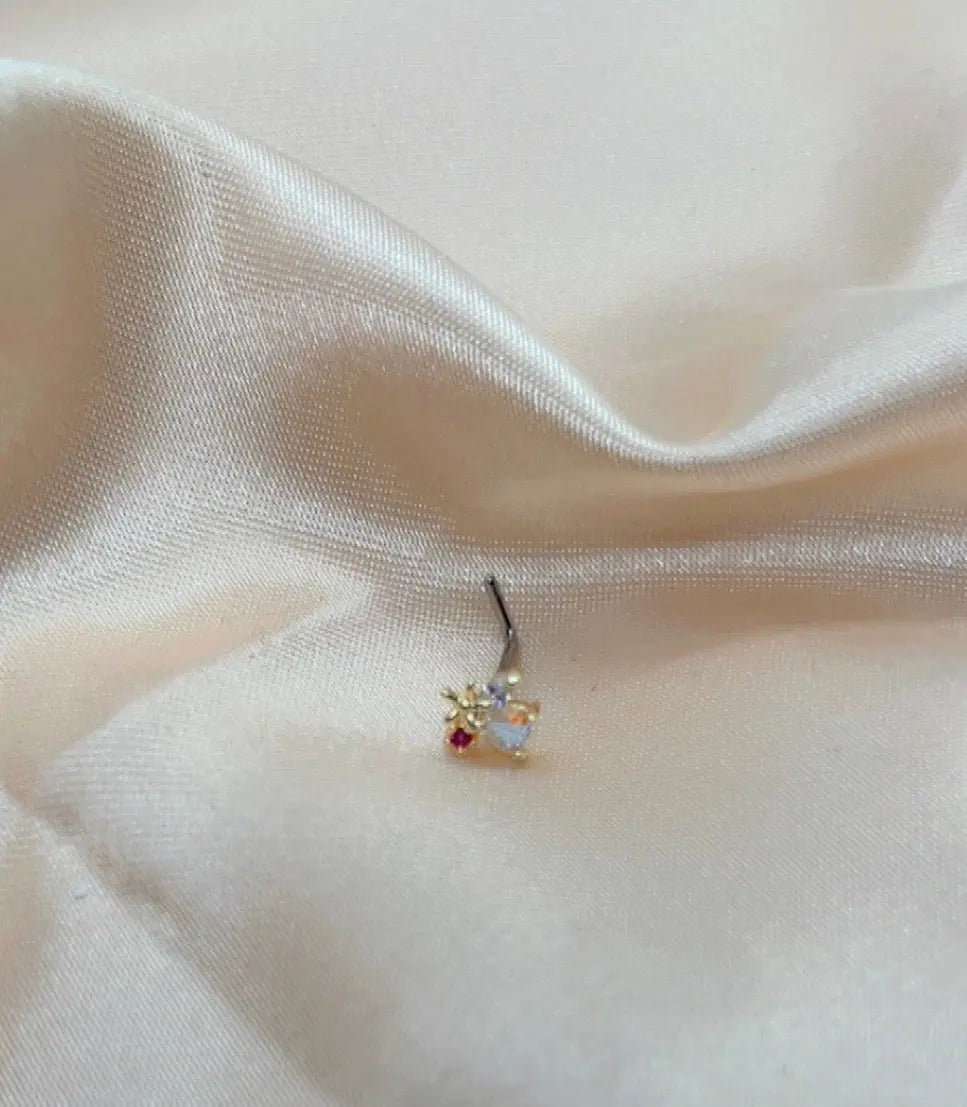 Fais briller ta personnalité avec ce piercing de nez unique en forme de petit papillon, délicatement orné d’un zircon blanc étincelant, d’un zircon violet foncé profond, et d’une fleur dorée finement travaillée. Un bijou au design symbolique et féerique, idéal pour celles qui aiment les détails délicats et originaux.