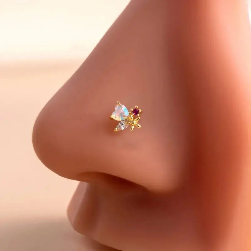 Piercing Nez Papillon & Fleur – Zircon Blanc et Violet Foncé – Tige en L "Miki Doré"