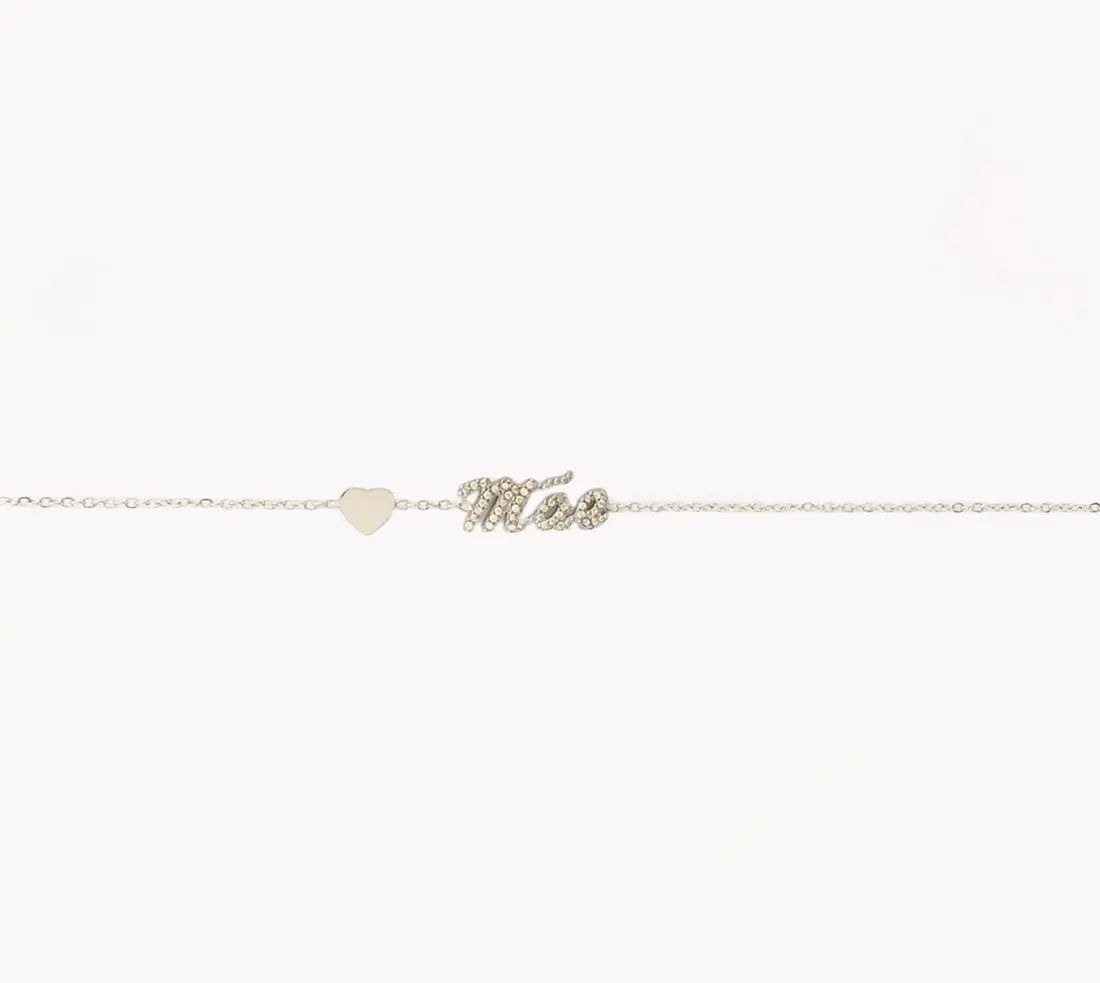 Ce bracelet en acier inoxydable argenté rend hommage à toutes les mamans avec style et émotion. Sa chaîne en maille fine soutient l’inscription "mãe" (maman en portugais), délicatement ornée de strass étincelants, et accompagnée d’un cœur argenté plein, symbole d’un amour pur et éternel.