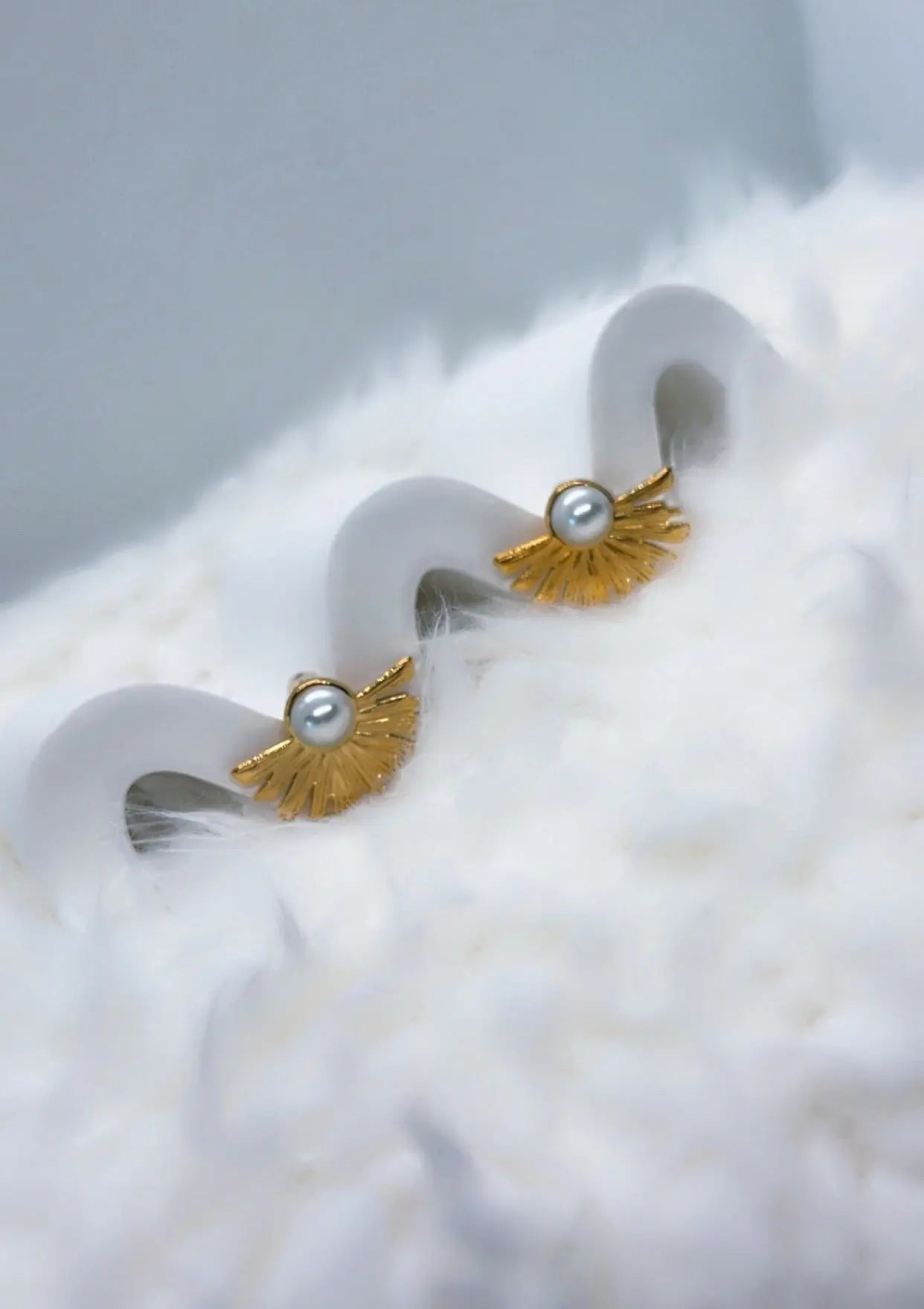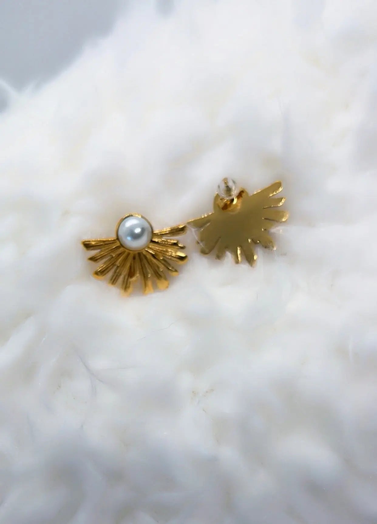 Boucles d’Oreilles Demi-Soleil Doré & Perle Blanche Nacrée – Acier Inoxydable "Leyna"