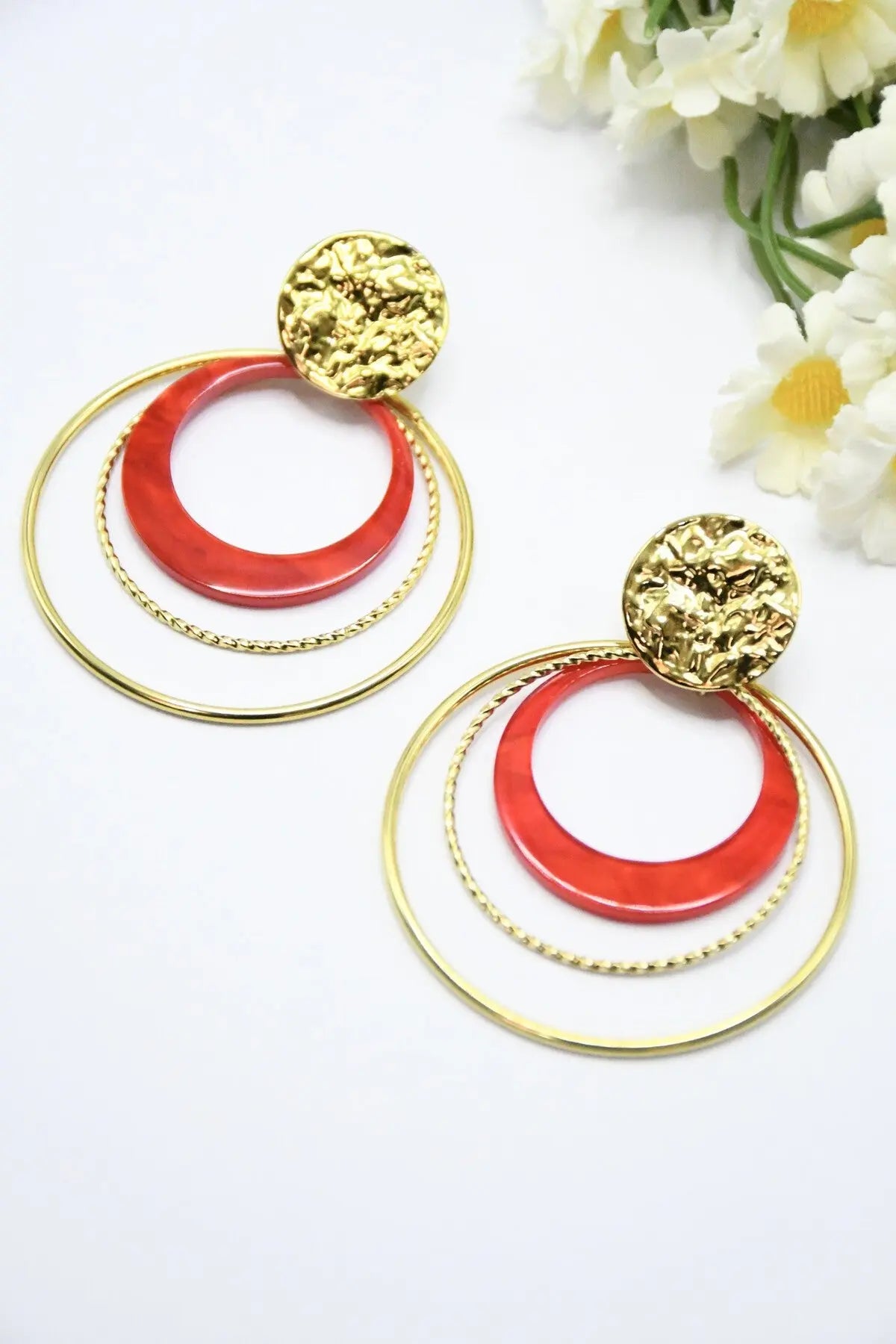 Boucles d’oreilles pendantes multi-anneaux doré, rouge et tressé – Acier inoxydable effet martelé "Elna"