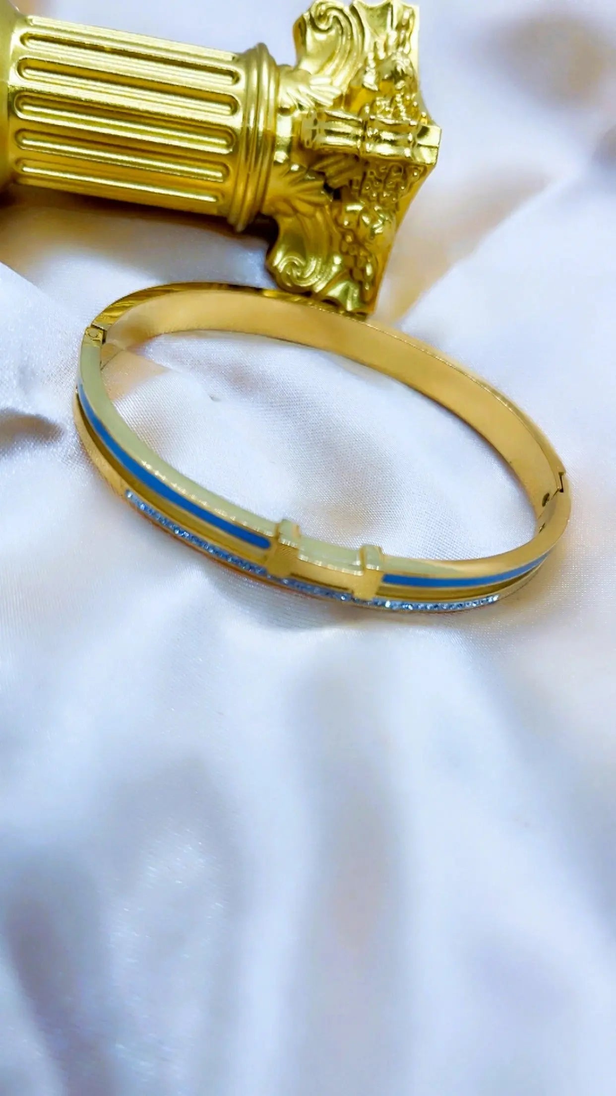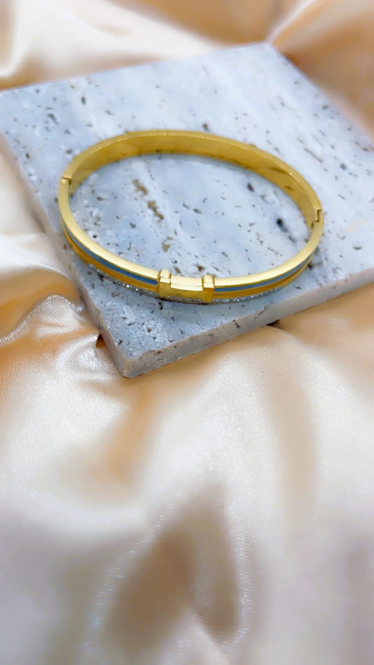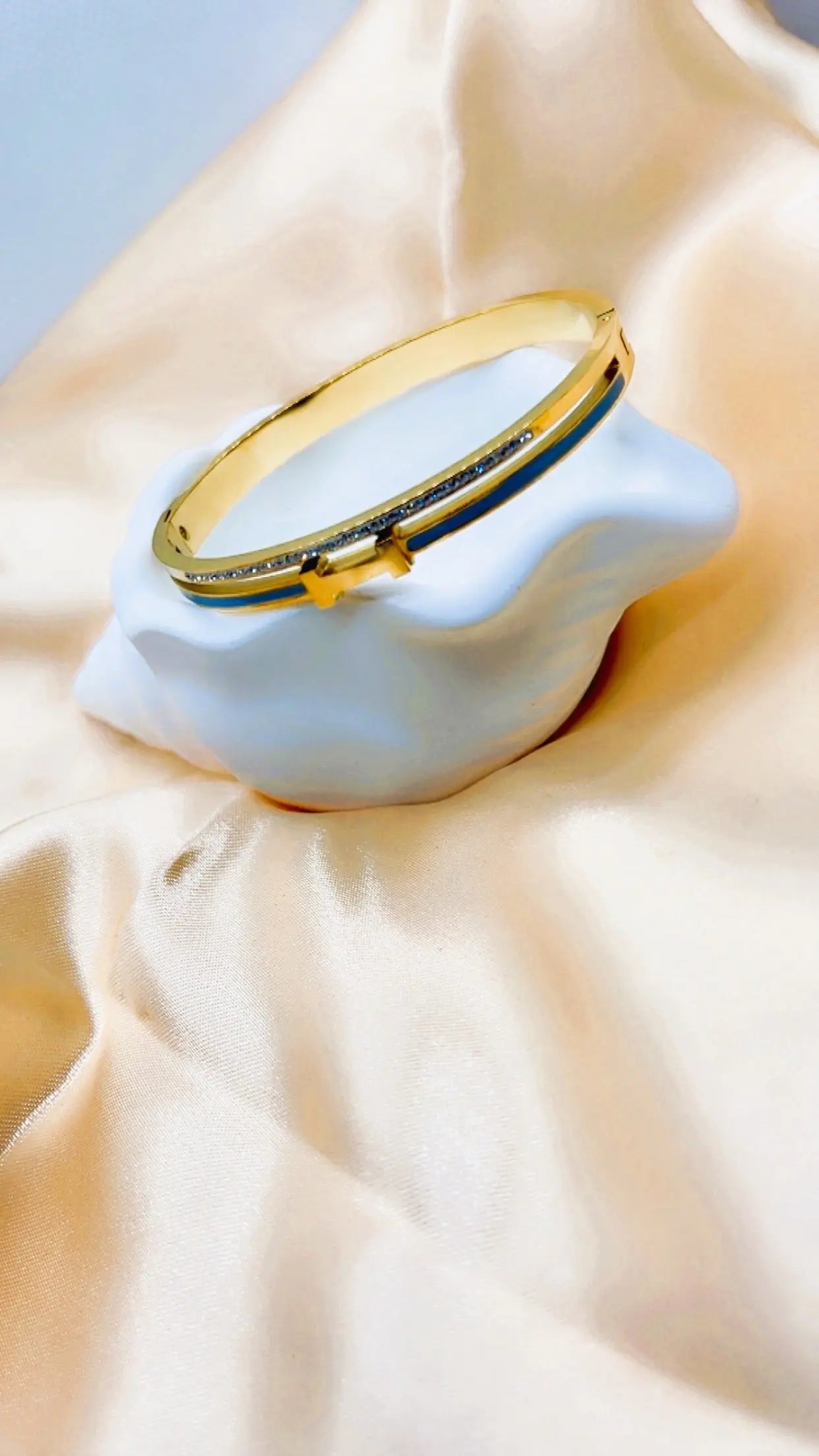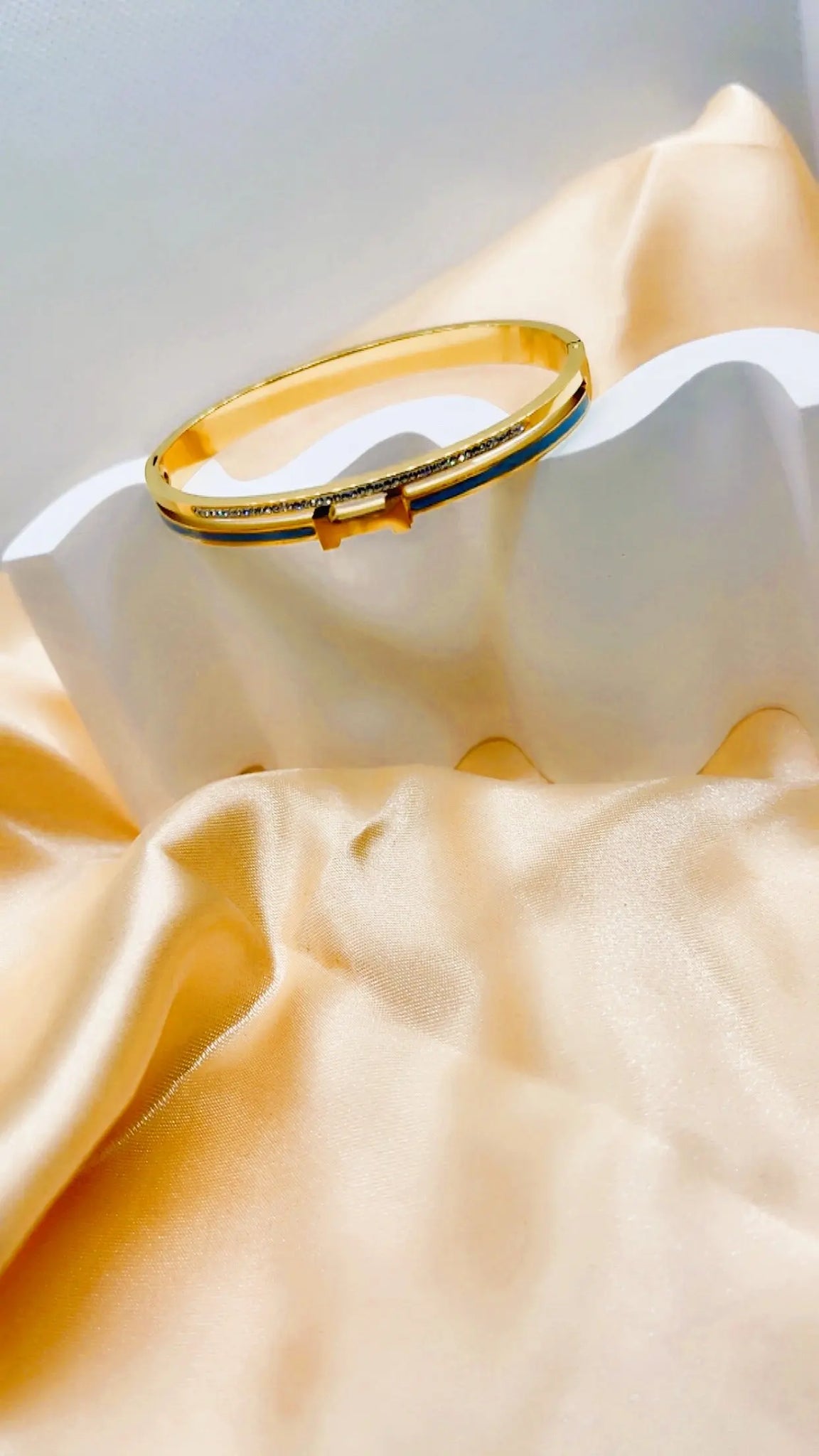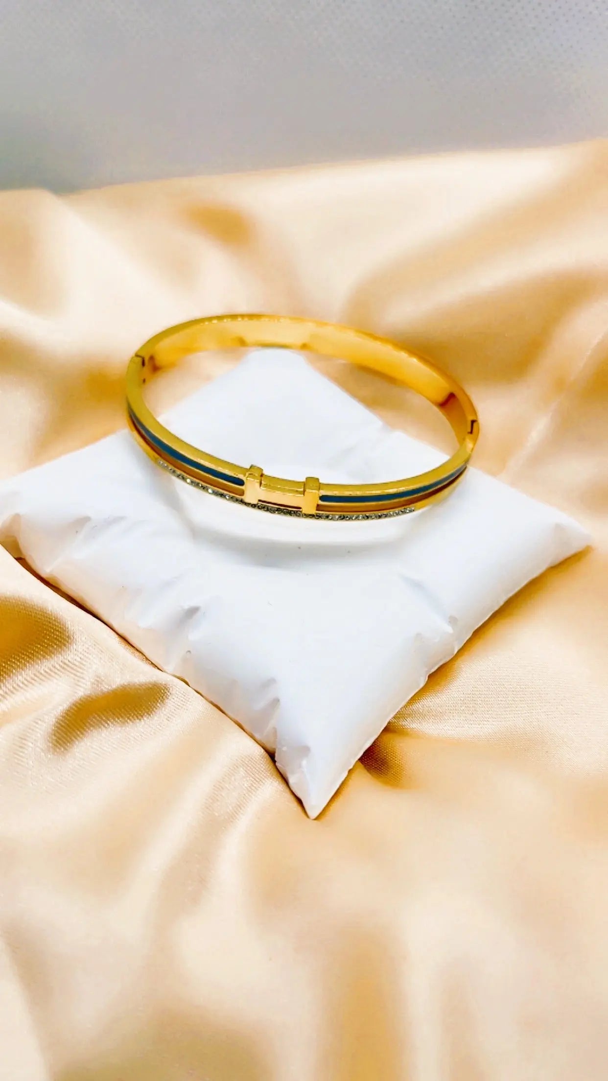 Craquez pour l'élégance raffinée de ce bracelet jonc en acier inoxydable doré. Il se distingue par sa lettre “H” centrale, son liseré gris sophistiqué, et de fins strass blancs qui captent la lumière avec subtilité. Un accessoire tendance au design luxueux, à prix accessible.