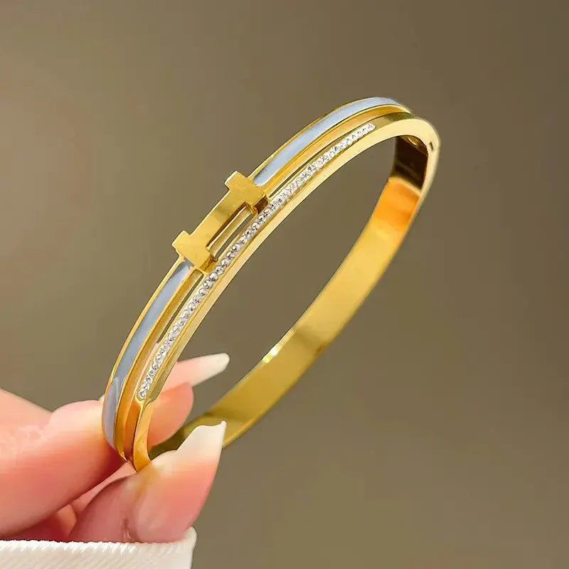 Bracelet Jonc Doré "H" – Liseré Gris & Strass Blancs – Acier Inoxydable Gris"