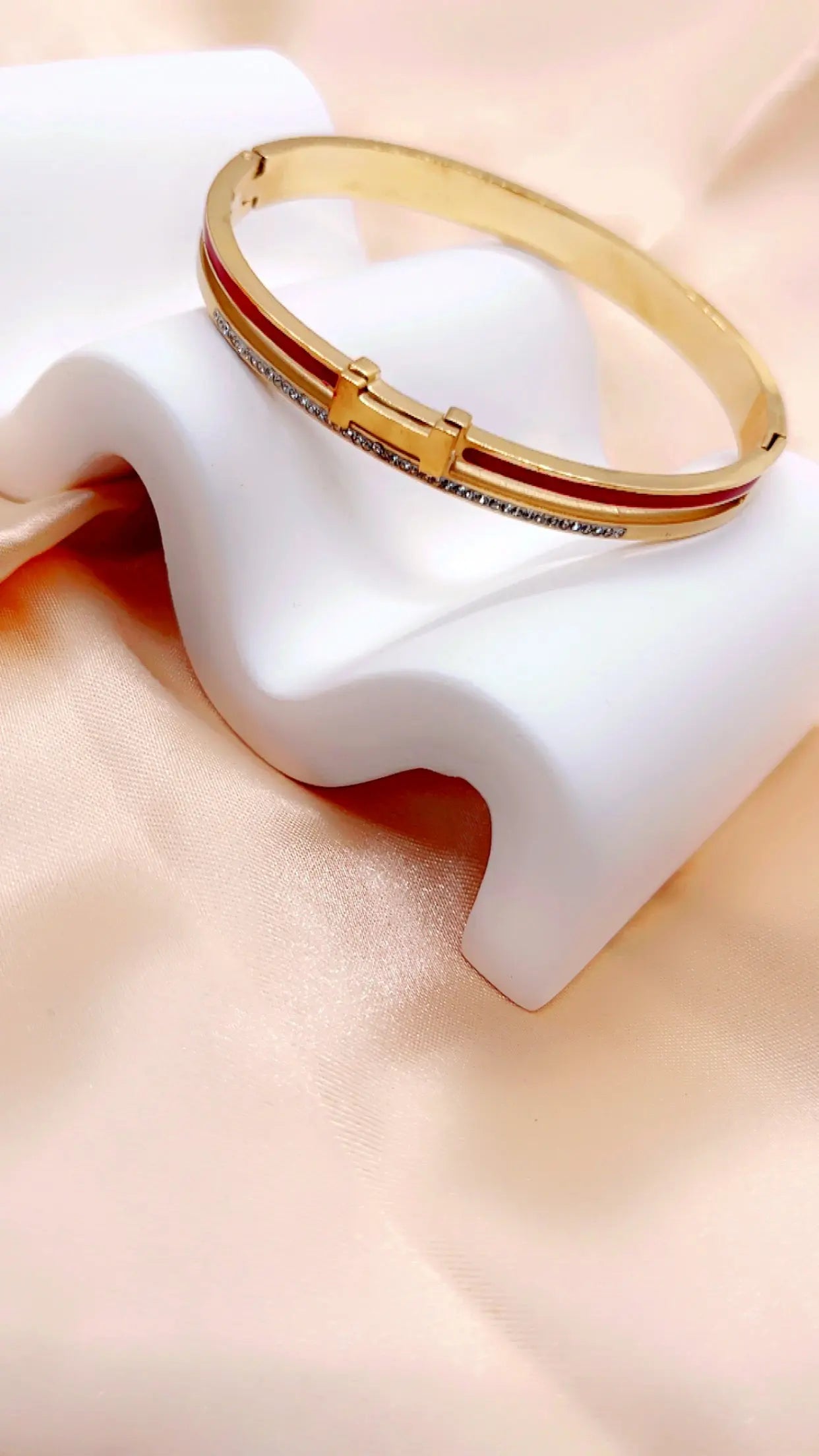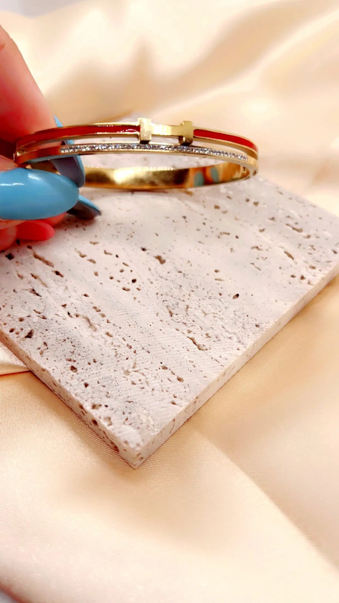 Alliez élégance et caractère avec ce bracelet jonc doré en acier inoxydable. Son liseré rouge éclatant apporte une touche de couleur audacieuse, parfaitement équilibrée par de discrets strass blancs et la lettre H en son centre. Un bijou chic, moderne et intemporel.