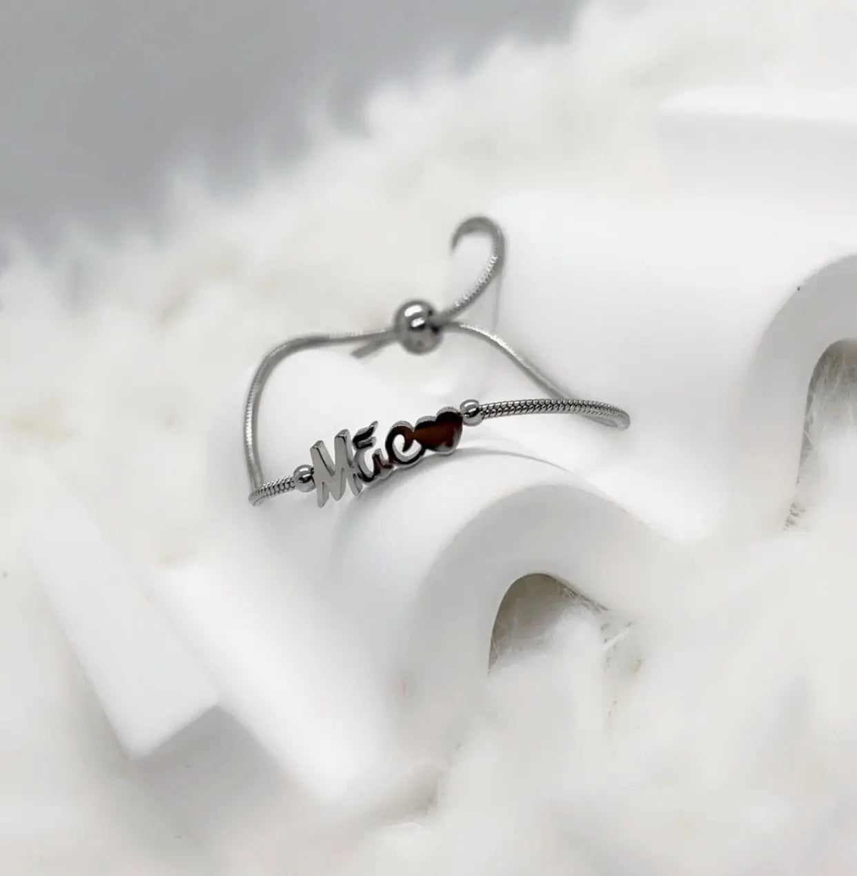 Ce magnifique bracelet "Mãe" en acier inoxydable argenté est une déclaration de tendresse. "Mãe", qui signifie maman en portugais, est finement gravé sur un médaillon, accompagné d’un petit cœur délicat – une touche d’amour subtile mais puissante.